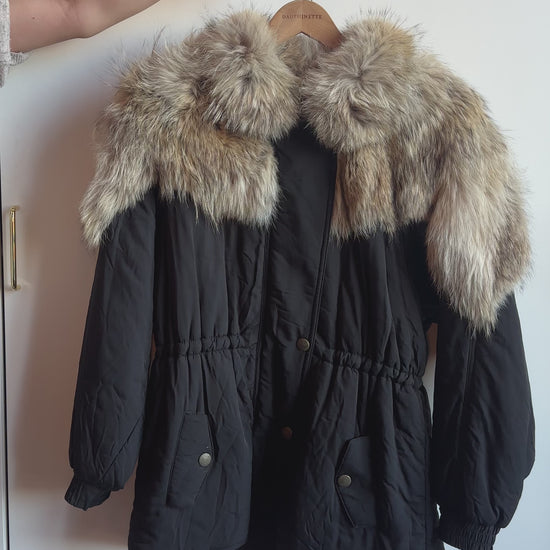 Ultra-warm, well-appointed 1970s puffer with coyote fur. Black, 100% nylon shell. Antique gold-tone snap closures.