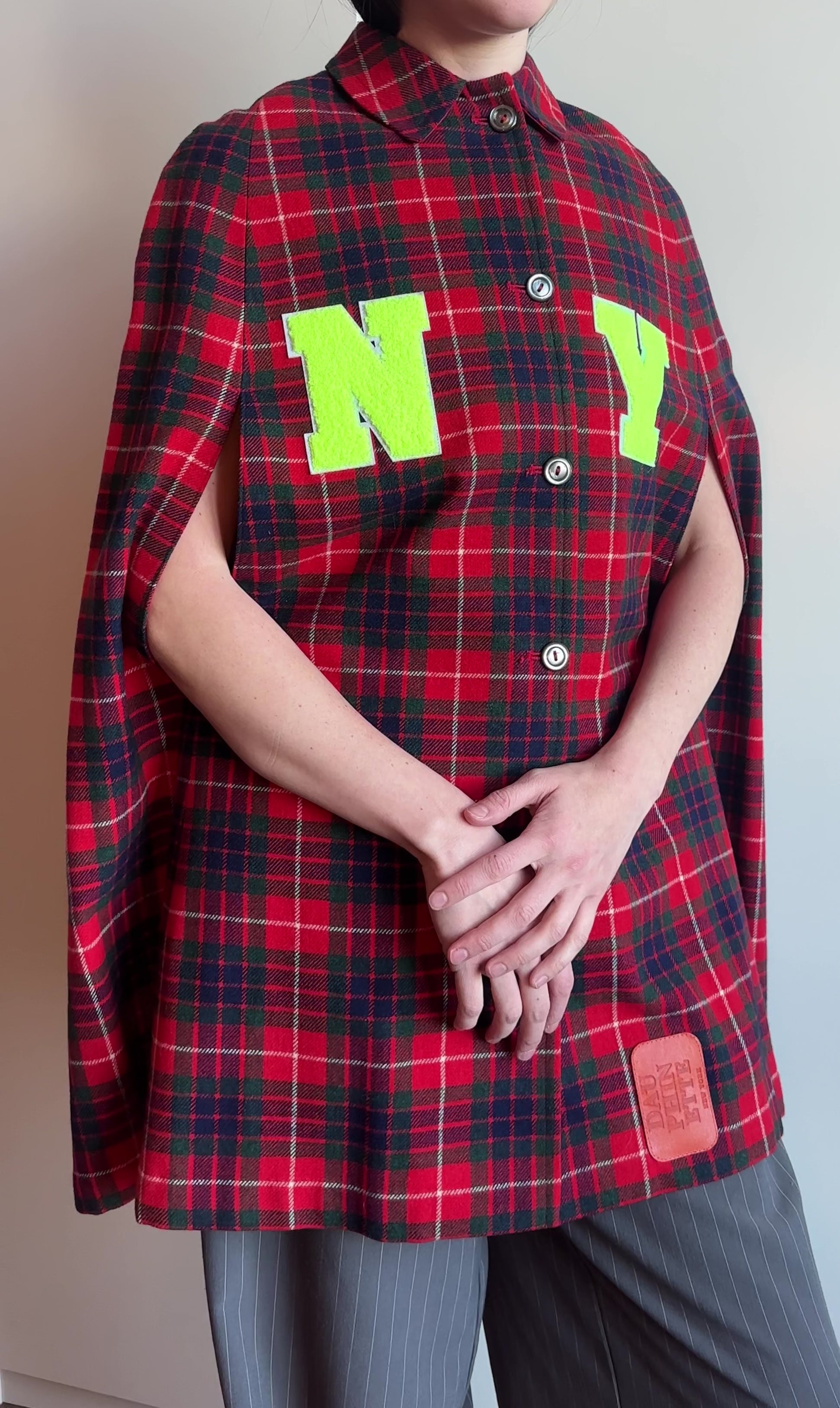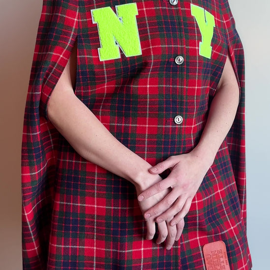 1970s tartan wool cape, upcycled with our signature letterman details and a leather Dauphinette patch.