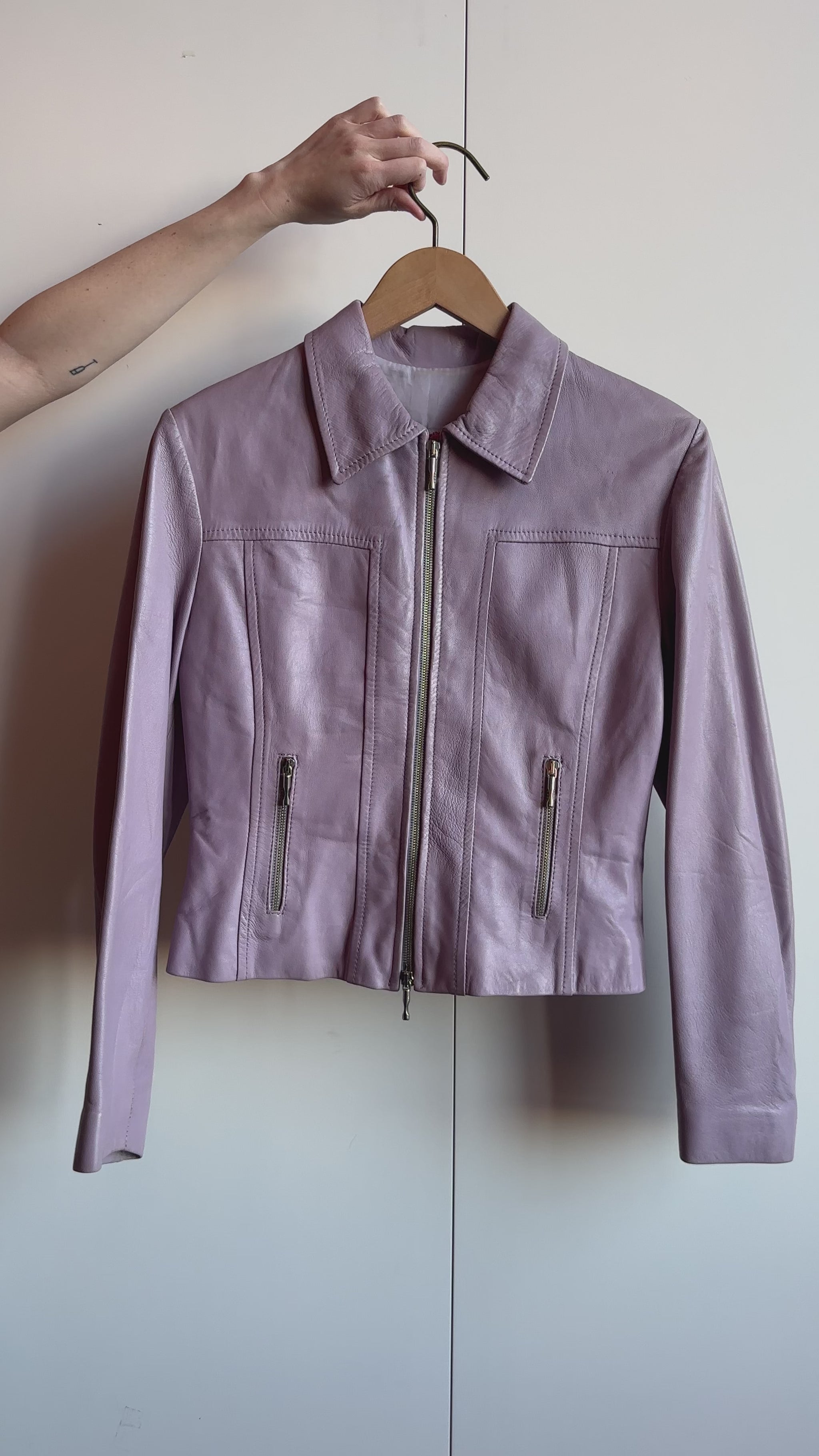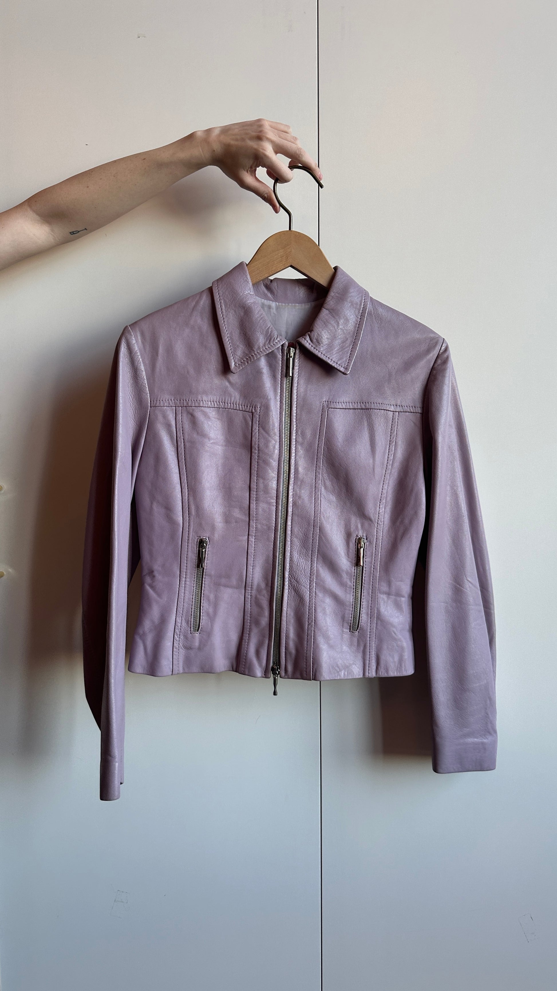 Icy lilac purple leather jacket from France. Heavy, sturdy silver zip.