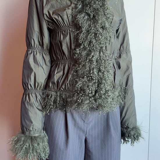 2000s drab olive puffer jacket with adorable ruched detailing and tonal Mongolian shearling trim and cuffs. Hidden hook-and-eye closures to keep you warm.