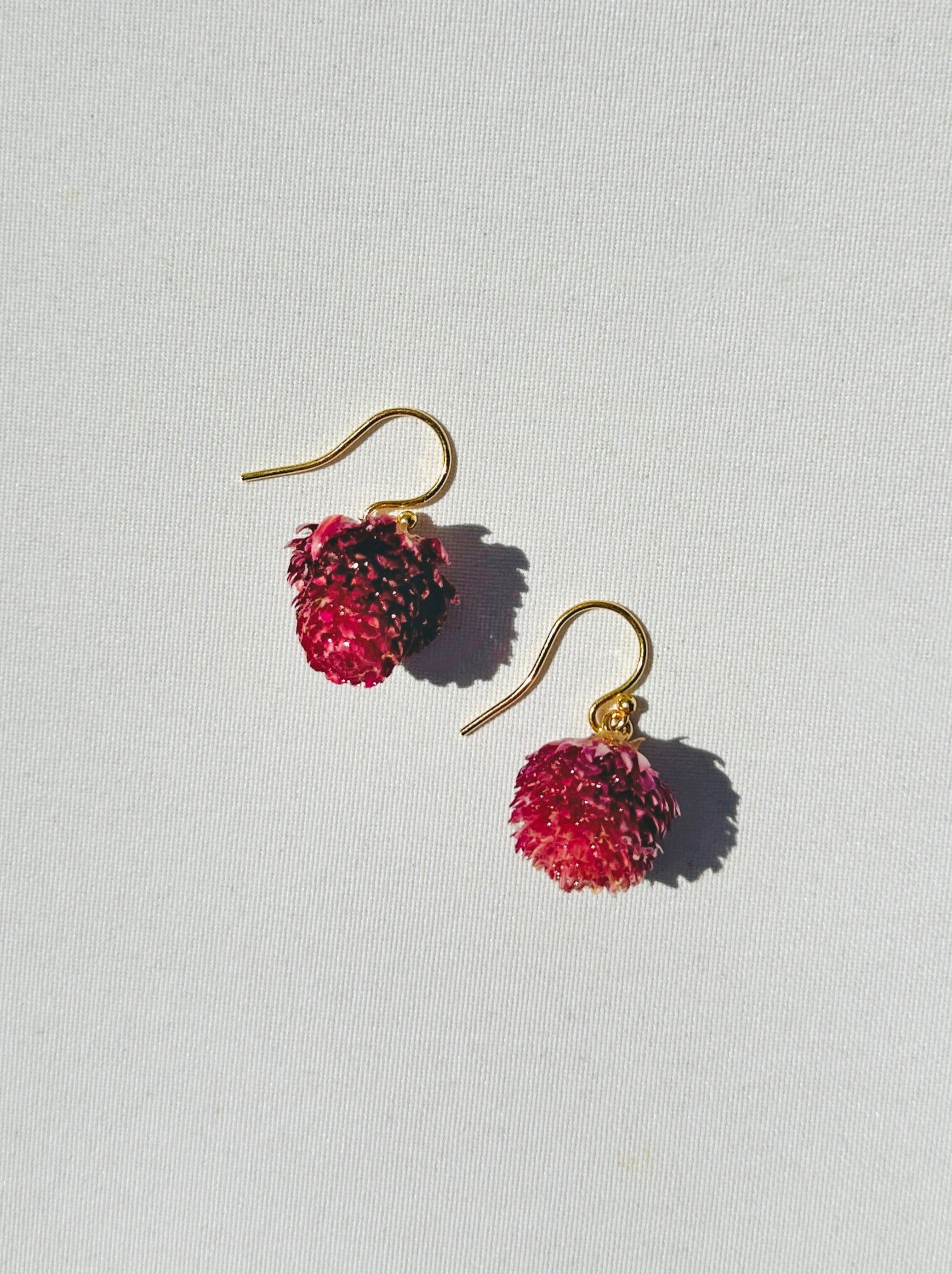 Spiky amaranth flower preserved in eco-friendly resin. Natural color ranges from a soft pink-purple to a deep raspberry hue. 14k gold-plated sterling hooks.